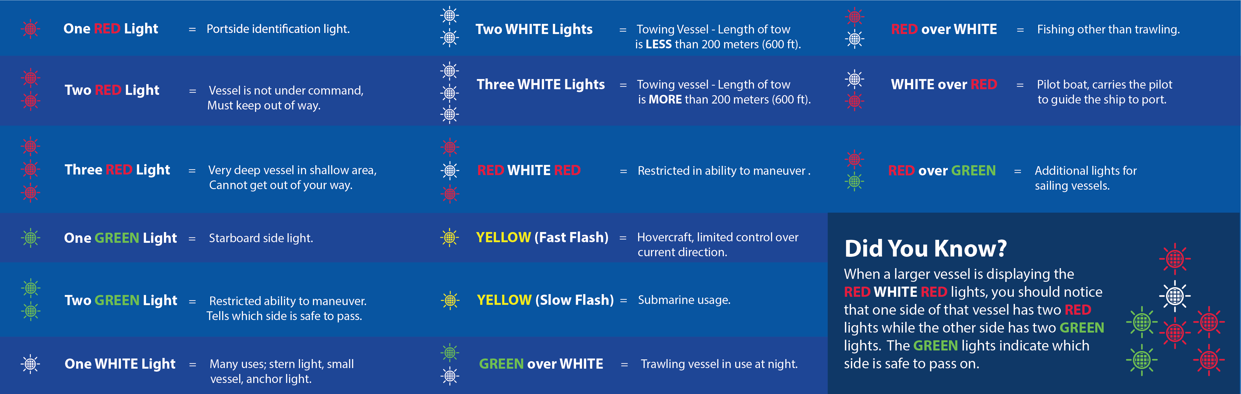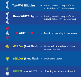 The thing is, knowing these colors isn’t enough. You need to be aware of how larger vessels will be using these lights. Oftentimes they use a combination of two or more lights to indicate a message to other vessels. Below is a quick summary of some of the most commonly used marine lighting combinations.