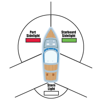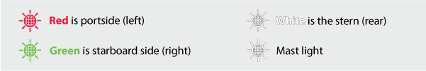 The lighting system is simple, as the three colors indicate a specific side of the vessel. Imagine you are standing on your boat facing the bow. To your left is the port side and a red light. To your right is the starboard side and a green light. Directly behind you at the stern is a white light. So when you look out onto the water at night and see a green light on the left and a red light on the right of another vessel, you know they are approaching your vessel. Take a look at the image here to see a simplified version.