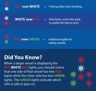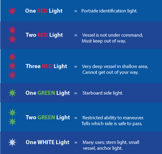 - Two Green lights – Vessel is restricted in ability to maneuver. Tells you which side is clear to pass